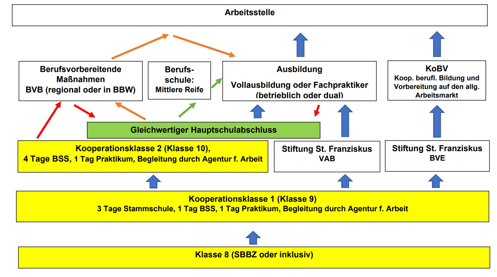 Oberstes Ziel muss es sein, Schülern den Übergang in die Berufs- und Arbeitswelt zu ermöglichen. Aus der folgenden Übersicht wird deutlich, dass es hierzu verschiedene Wege gibt. In Zusammenarbeit der beruflichen Schulen, des Jugendberufshelfers, des Sonderpädagogen und der Agentur für Arbeit wird versucht, einen angemessenen Weg zu finden, orientiert an den individuellen Wünschen und Fähigkeiten des Jugendlichen.
